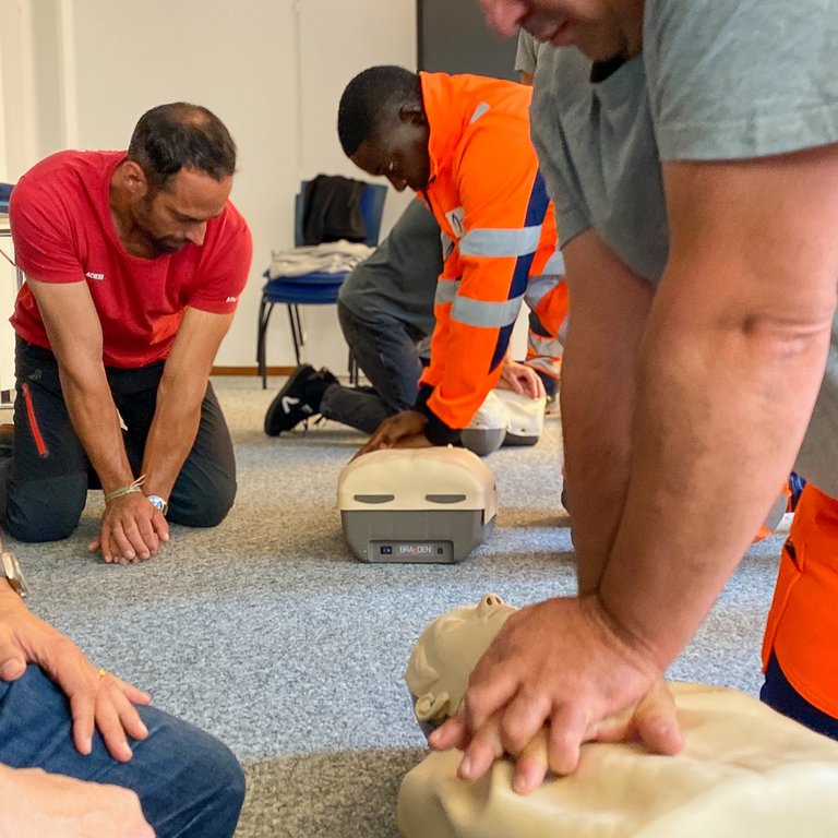 Tous les deux ans, ils entraînent les gestes qui sauvent en conditions réelles, que ce soit au bureau, au fond d’une fouille ou même dans la vie quotidienne. Massage cardiaque, immobilisation d’un membre, arrêt d’une hémorragie, soin d’une brûlure ou reconnaissance des signes d’un AVC font partie des gestes exercés durant le cours.